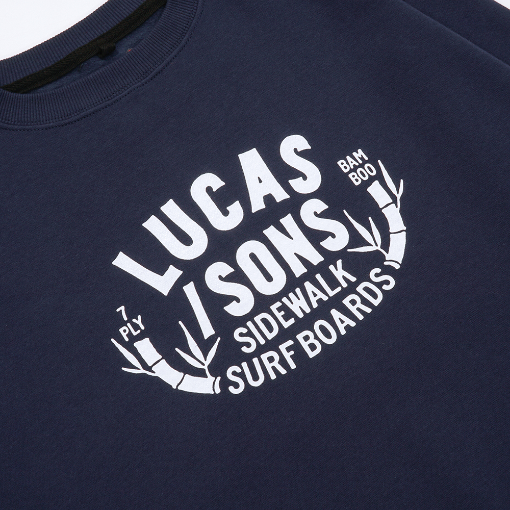 BAMBOO CREW NVY – Lucas and Sons Bamboo Crew Crewneck Sweater in Navy 80% cotton, 20% polyester (280-300 gsm). This Lucas and Sons crewneck sweater is finished with plastisol screen printed chest ‘7-ply bamboo’ graphics.