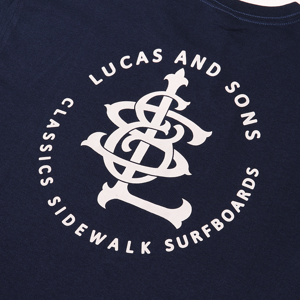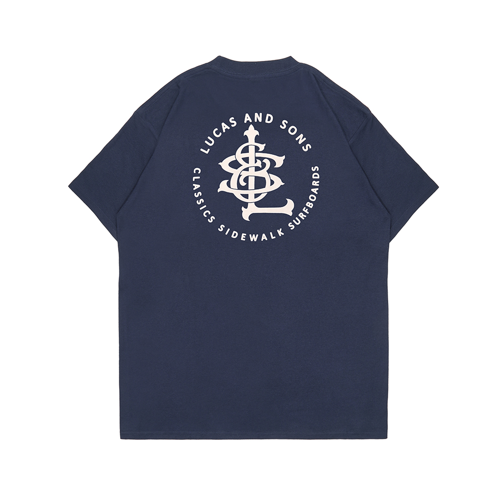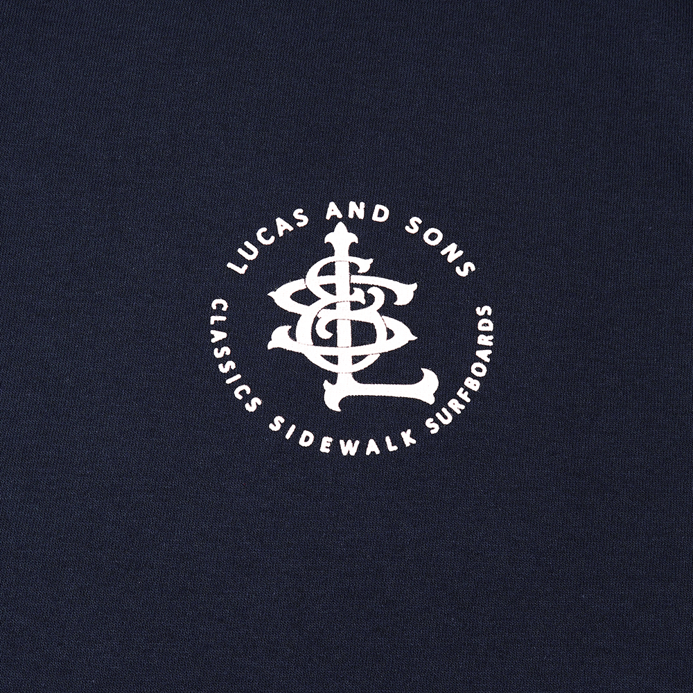 CLASSIC SIDEWALK NVY – Lucas and Sons Classic Sidewalk T-Shirt in Navy 100% Heavy Cotton (180 gsm) preshrunk body size tubular construction. This Lucas and Sons t-shirt is finished with discharge screen printed left chest and rear ‘classic sidewalk’ graphics.