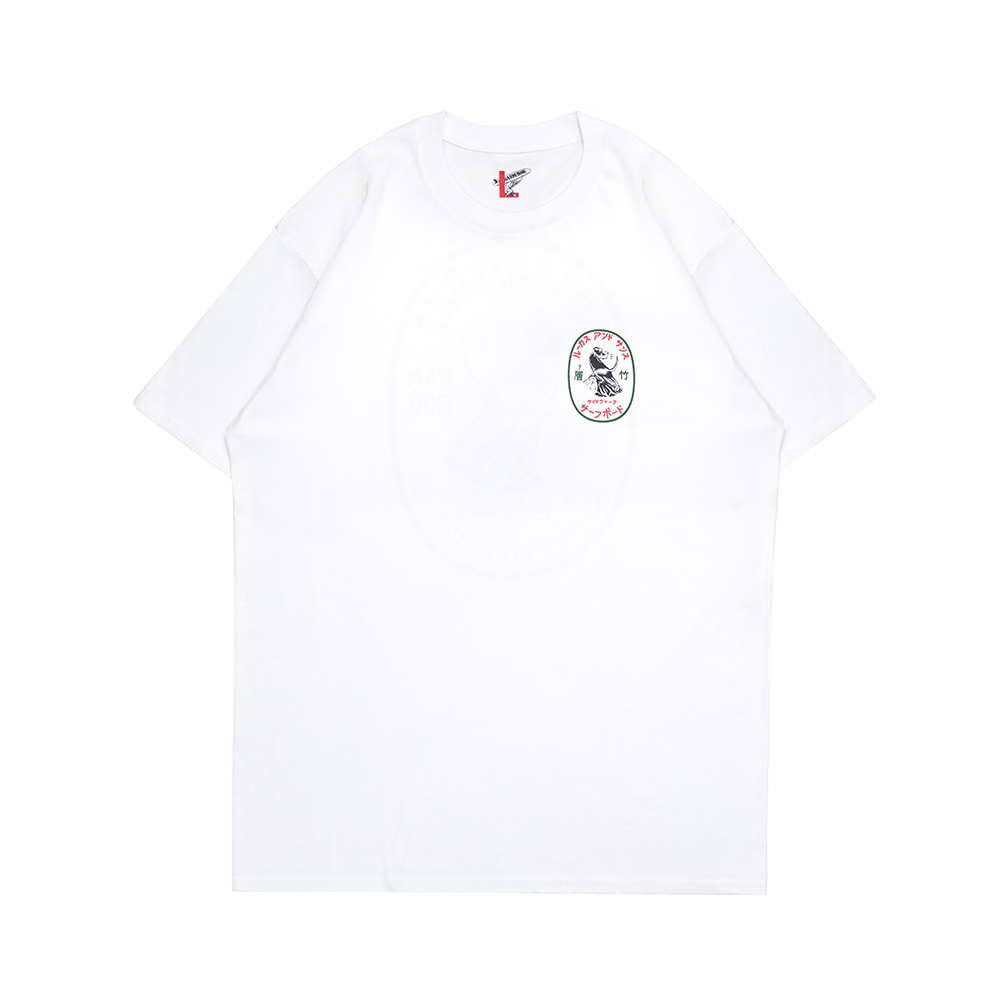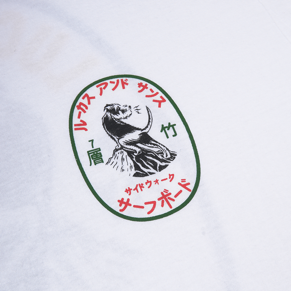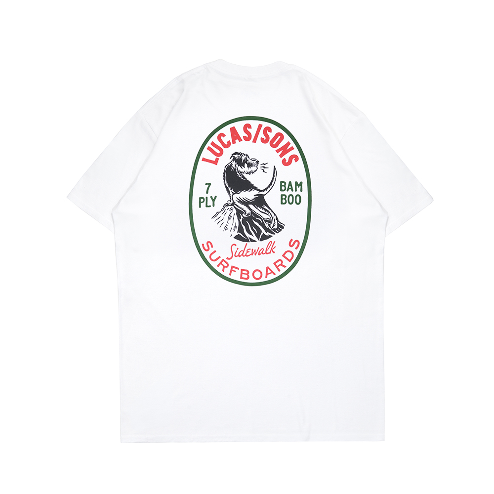 DOG WHT – Lucas and Sons Dog T-Shirt in White 100% Soft Cotton (145-150 gsm) preshrunk body size tubular construction. This Lucas and Sons t-shirt is finished with sw screen printed left chest and rear ‘dog sidewalk surfboards’ graphics.