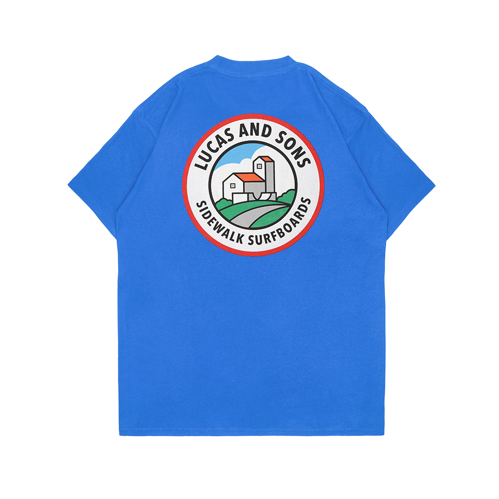 HOUSE RYB – Lucas and Sons House T-Shirt in Royal Blue 100% Heavy Cotton (180 gsm) preshrunk body size tubular construction. This Lucas and Sons t-shirt is finished with plastisol screen printed left chest and rear ‘sidewalk surfboard house’ graphics.
